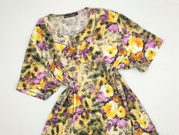 Bluzka damska Deluxe Stars, rozmiar L - Krój: luźny T‑shirt z krótkim rękawem - Dekolt w kształcie litery V, ozdobiony małymi nitami/koralikami oraz wstawką imitującą zapięcie - Wzór: efektowny na...