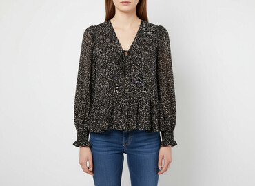 Elegancka bluzka damska marki Reserved w rozmiarze EUR 38, UK 10. Czarna bluzka zdobiona jest drobnym, kwiatowym wzorem w odcieniach beżu i bieli. Posiada kopertowy dekolt w kształcie litery V, dłu...