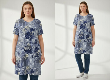 - Wzór: patchwork/etyno-kwiatowy w odcieniach granatu, niebieskiego, bieli i beżu; gęsty nadruk z motywami geometryczn...