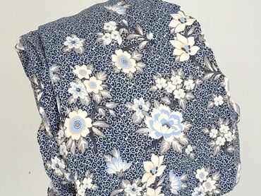 - Wzór: drobne motywy na granatowym tle z kwiatowym nadrukiem w odcieniach błękitu, ecru i szarości (intensywniejszy przy dolnej części bluzki i rękawów)