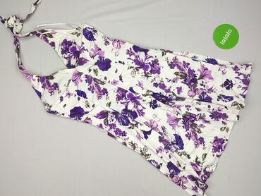 Sukienka letnia na ramiączkach, we wzór kwiatowo-geometryczny w odcieniach lila, lawendy, różu i bieli. - Krój: kopertowy dekolt w szpic, dopasowana góra z elastycznym marszczeniem (smocking) w ta...