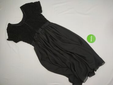 Elegancka sukienka koktajlowa marki B&B Studio w rozmiarze 36, idealna na specjalne okazje. Górna część sukienki jest czarna z krótkimi rękawami, a dekolt wykończony jest beżową lamówką. Dół sukien...