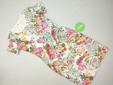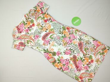 Sukienka damska o długości do kolan, w rozmiarze 38, z okrągłym dekoltem i krótkimi rękawami. Dominujący biały kolor uzupełniają wzory w odcieniach czerwieni, zieleni i niebieskiego. Zapięcie na za...Condition: