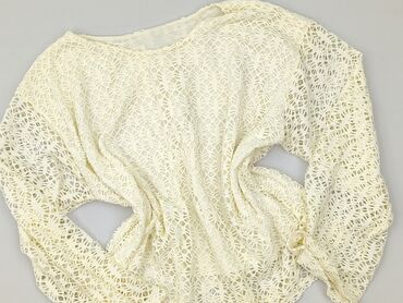 Ażurowa bluzka damska w kolorze ecru/kremowym. - Fason: luźny, prosta linia, okrągły dekolt - Rękawy: długie - Materiał: koronkowa/siateczkowa dzianina o wyraźnym, liściastym wzorze; pod spodem le...