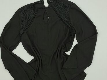 Czarna bluzka AMISU, rozmiar S. - Krój: dopasowany, lekko wydłużony tył. - Rękaw: długi. - Dekolt: stójka zapinana z tyłu na guziki, z ozdobnym wycięciem łezką z przodu. - Detale: koronkowe wstawk...
