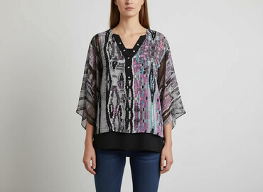 Bluzka damska z wbudowanym topem - Fason: luźna, lekko opadająca, z szerokim ściągaczem u dołu z czarnej dzianiny - Dekolt: V z czarną listwą zapinaną na napy (srebrne zatrzaski) - Rękawy: długie,...