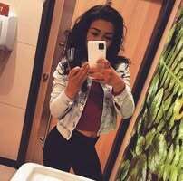 Granatowa koszulka damska z krótkim rękawem, ozdobiona z przodu dużym nadrukiem "Believe". Nadruk wykonany jest białą czcionką z dekoracyjnymi elementami przypominającymi cekiny lub brokat, dodając...