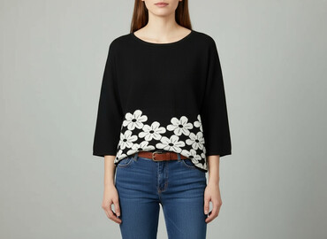 Czarna bluzka z długim rękawem, ozdobiona dużym motywem kociej głowy z drobnych, błyszczących dżetów na przodzie.