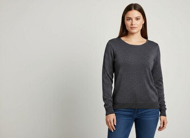 Ciemnoszary sweter z golfem, wykonany z dzianiny. Jest to element odzieży unisex, odpowiedni do noszenia na co dzień. Charakteryzuje się długimi rękawami oraz elastycznymi ściągaczami przy mankieta...