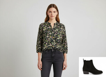 Bluzka damska marki Greenpoint z kwiecistym wzorem w odcieniach zieleni, różu i beżu na czarnym tle. Posiada długie rękawy zakończone elastycznymi mankietami oraz dekolt w kształcie litery V z kołn...