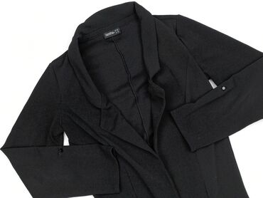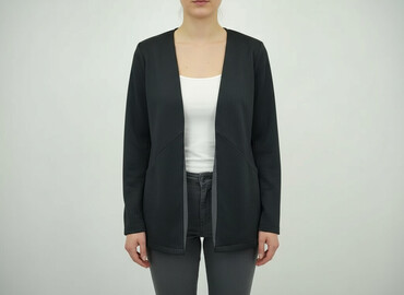 - Fason: bez zapięcia, długi żakiet/kardiganowy płaszczyk z klapami; prosta linia, bez podszewki
