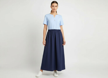 - Fason: długa, rozszerzana ku dołowi; bez rękawów, szerokie ramiączka, okrągły dekolt.