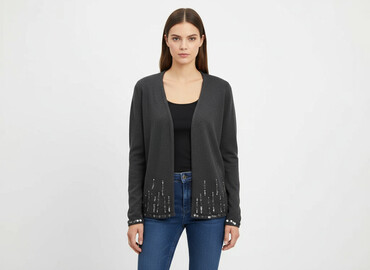 Ciemnoszary, rozpinany kardigan damski z długimi rękawami. Charakteryzuje się otwartym przodem bez zapięcia oraz dekoltem w kształcie litery V. Dół kardiganu i mankiety rękawów ozdobione są połysku...