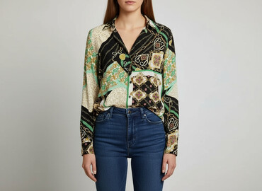 Bluzka damska we wzory, z długimi rękawami. Charakteryzuje się bogatym, patchworkowym wzorem łączącym motywy łańcuchów, barokowych ornamentów i geometrycznych kształtów w odcieniach czerni, złota, ...