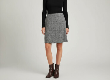 Używana spódnica damska w idealnym stanie. Wykonana z materiału w kolorze szaro-brązowym o splocie w jodełkę. Klasyczny fason do kolan, idealna do pracy lub na oficjalne okazje.