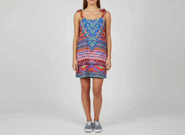 Sukienka boho z lekkiej, zwiewnej tkaniny, w wielobarwny, patchworkowy/etniczny print (mięta, turkus, róż, lila, żółty, zieleń).