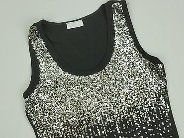 Czarny top damski na ramiączkach z cekinami - Krój: dopasowany, bez rękawów, okrągły dekolt z przodu, głębsze wycięcie z tyłu - Materiał: ażurowa siateczka z gęsto naszytymi czarnymi cekinami; wew...