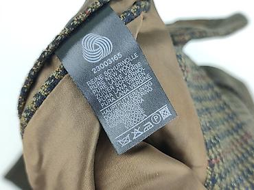 - Kolorystyka tkaniny: mieszanka odcieni oliwkowego/brązu z akcentami granatu i burgundu, tworząca elegancką, drobną pepitkę z dyskretną kratą