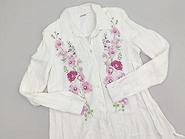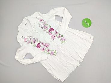 Biała koszula damska BODYFLIRT z długim rękawem i kołnierzykiem, zapinana na guziki na całej długości. Przód zdobi efektowny, dwustronny nadruk kwiatów w odcieniach różu i fioletu z zielonymi akcentami. Tył gładki, lekko wydłużony dół z rozcięciami po bokach zapewnia swobodę ruchu.