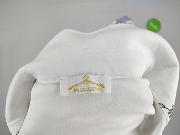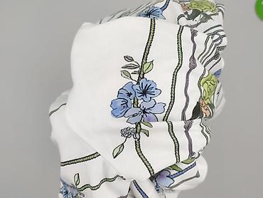 - Wzór: biały materiał z poziomymi, „linowymi” pasami i wielobarwnymi nadrukami kwiatów (głównie błękitne i zielone) oraz drobnymi motywami ilustracyjnymi