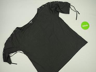 Czarna damska bluzka z krótkim rękawem - Fason: lekko luźna, dół zakończony elastyczną listwą - Dekolt: półokrągły, ozdobny karczek z naszywanymi aplikacjami i błyszczącymi elementami; wstawka na ...