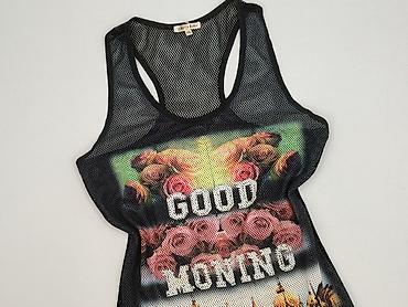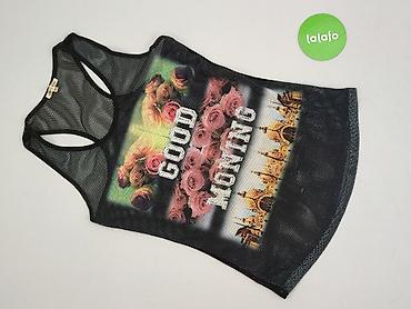 Czarny top/bluzka damska bez rękawów z nadrukiem liści - Krój: bezrękawnik z okrągłym dekoltem - Przód i tył: wstawki z czarnej, półprzezroczystej siateczki po bokach i przy dekolcie - Materiał za...