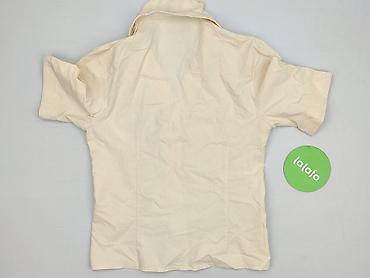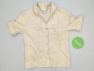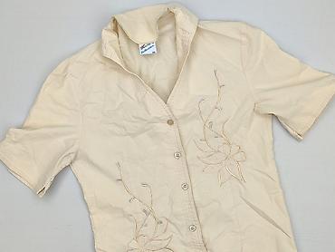 Bluzka damska BM, rozmiar M. - Kolor: kremowy/ecru - Krótki rękaw - Dekolt okrągły - Przód z ozdobnym panelem w roślinnym, beżowym wzorze - Listwa z guzikami dekoracyjnymi na środku - Delikatnie e...