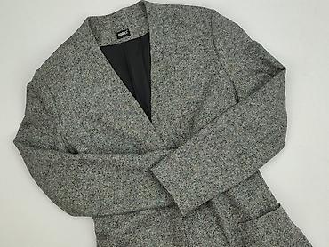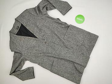 Szary żakiet damski o minimalistycznym kroju - Klasyczny, prosty fason z zapięciem na 3 guziki z przodu - Asymetryczna stójka/kołnierz z wewnętrzną wstawką w jaśniejszym melanżu - Dwie duże naszyw...Stan: