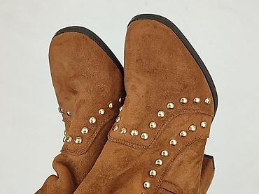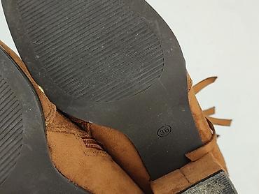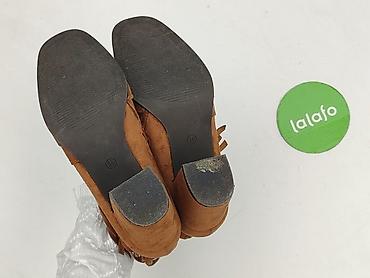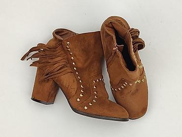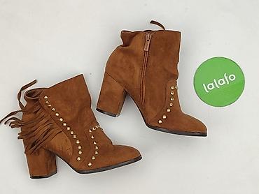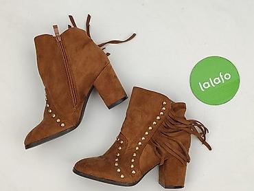 Damskie botki na obcasie, zamszowe, brązowe - Rozmiar: 38 (oznaczenie na podeszwie) - Materiał cholewki: naturalny zamsz w kolorze ciemnego brązu - Zapięcie: suwak po wewnętrznej stronie ułatwiają...Stan: