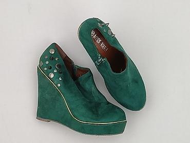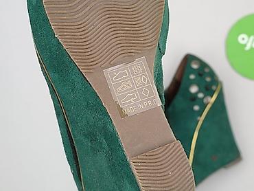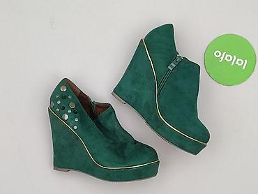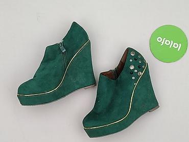 Wysoki, stabilny koturn optycznie wydłuża sylwetkę, a boczny suwak ułatwia szybkie zakładanie. Zdobienia i złote akcenty dodają charakteru i podkreślają głęboki zielony kolor. Używane, stan bardzo dobry.