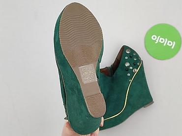 Zielone damskie botki na obcasie - Rozmiar: 36 (wybity na podeszwie) - Cholewka: zamsz w odcieniu oliwkowej zieleni - Detale: ozdobny pasek z klamrą w kolorze złota, skórzane wstawki - Zapięcie: w...