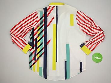 - Kolorystyka i wzór: biała baza z multikolorowym, graficznym nadrukiem (granat, czerwień, żółty, turkus, czerń); rękawy w czerwono‑białe pasy; kontrastowe mankiety w granacie i neonowej żółci; kołnierzyk z żółtą lamówką i kolorowymi wstawkami