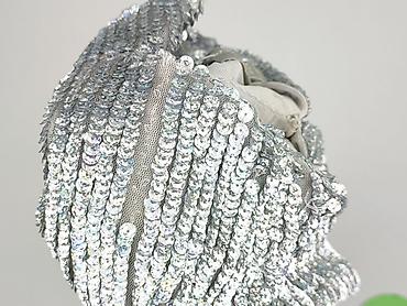 - Wykończenie: gęsto naszyte srebrne cekiny o holograficznym połysku, tworzące pionowe pasma