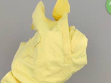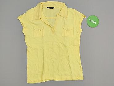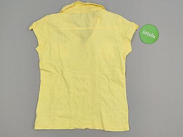 Bluzka damska z krótkim rękawem, pastelowożółta. - Krój: luźny, prosta linia z rozcięciami po bokach u dołu. - Zapięcie: ozdobny rząd dużych, materiałowych guzików z przodu (dekoracyjne, asymetryc...