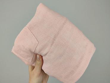 Bladoróżowa, zwiewna bluzka damska z krótkim rękawem. - Fason: luźny, lekko wydłużony tył; delikatne plisy na przodzie i tyle. - Dekolt: elastyczny, z troczkami do wiązania (możliwość noszenia kla...