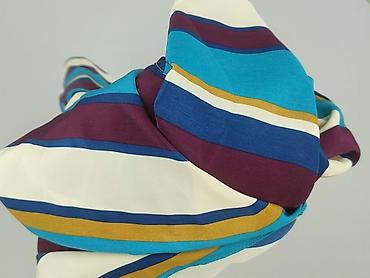 - Wzór: poziome pasy w odcieniach turkusu, granatu, burgundu, musztardy i ecru