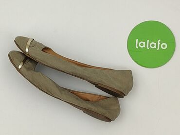 Beżowe baleriny damskie z dzianinową cholewką - Kolor: jasny beż/ecru - Rozmiar: 41 (oznaczenie na podeszwie) - Kształt: smukły, szpiczasty nosek - Cholewka: elastyczna, przewiewna tkanina o drobn...Baleriny damskie w kolorze beżowo‑taupe z ozdobną, złotą listwą na nosku.