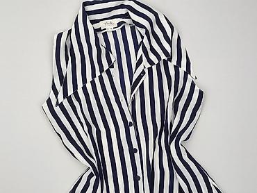 Koszula damska Lustrin, rozmiar M - Wzór: granatowo-białe paski (pionowe i ukośne), efekt lekkiego marszczenia/crinkle - Fason: dłuższa koszula zapinana na guziki, zaokrąglony dół, długi rękaw z m...