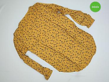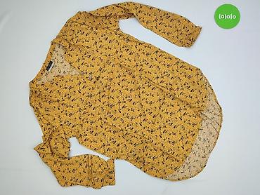 Bluzka damska z długim rękawem, w kwiatowy print na żółtym tle. - Krój: lekko taliowana, z marszczeniami przy mankietach; okrągły dekolt z małym rozcięciem i zapięciem na guzik z tyłu. - Wzór/kolo...