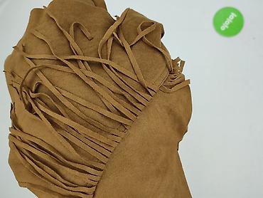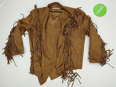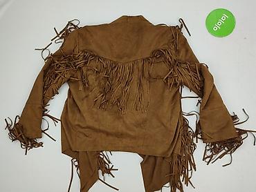 - Detale: długie frędzle w stylu western/boho wzdłuż przodów, na rękawach i na plecach; klapy z kołnierzem; wydłużone, kaskadowe poły z przodu
