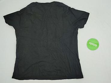 Czarna bluzka damska z krótkim rękawem, rozmiar XL. Lekko pudełkowy krój z obniżoną linią ramion i okrągłym dekoltem. Z tyłu niewielkie rozcięcie zapinane na guzik. Dół z wydłużonymi panelami/supła...