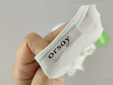 Biała bluzka damska Orsay - Krój: lekko taliowany, z marszczeniem/ściągaczem z tyłu w pasie podkreślającym sylwetkę - Rękawy: krótkie, bufiaste, zakończone elastyczną gumką - Zapięcie: listwa guzi...