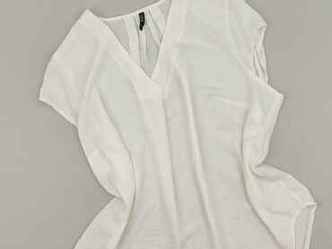 Biała koszula/bluzka damska z krótkim rękawem - Krój: luźny, zapinana na rząd guzików z przodu - Dekolt: w kształcie litery V - Rękaw: krótki, lekko bufowany - Dół: delikatnie wydłużony z tyłu, ma...