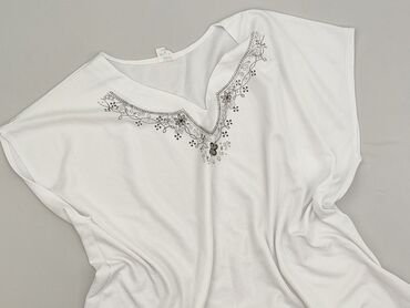 Biała bluzka damska z krótkim rękawem - Fason: luźna, lekko rozkloszowana, z marszczeniami przy dekolcie - Dekolt: szeroki, łódkowy/karczek z wiązaniem z tyłu - Rękawy: krótkie - Ozdoby: kwiatowe ...