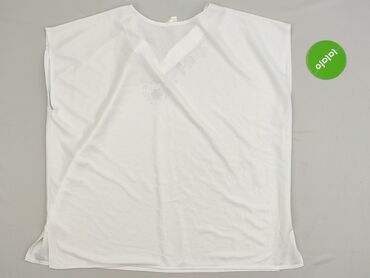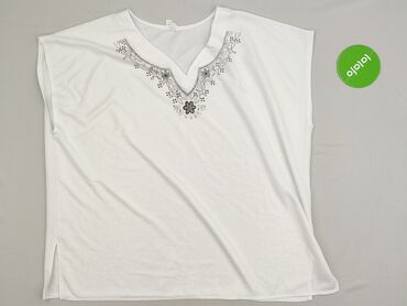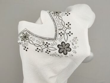 Bez rękawówBiała bluzka damska bez rękawów z dekoltem w serek. Luźny, prosty krój z krótkimi opadającymi rękawkami i rozcięciami po bokach u dołu. Przód zdobi nadruk w odcieniach szarości: kwiaty i koronkowe motywy wokół dekoltu. Materiał: 100% poliester (metka na zdjęciu). Przyjemna, lekko lejąca tkanina. Idealna do letnich stylizacji, pasuje do jeansów, spódnic i szortów. Rozmiar z metki: XXL (widoczny na wszywce). Kolor: biały.