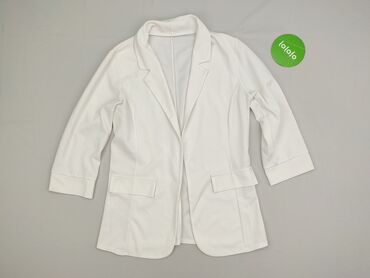 Biały damski żakiet z kołnierzem z klapami - Krój: lekko taliowany, długość do bioder - Zapięcie: pojedynczy guzik z przodu (metaliczny, trójkątny) - Kieszenie: dwie przednie kieszenie zapinane na...Stan: