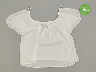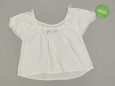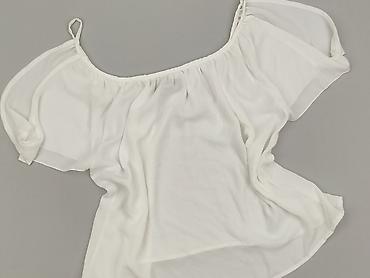 Biała bluzka damska z krótkim rękawem - Krój: luźna góra z szerokim, elastycznym pasem u dołu (smocking) podkreślającym talię - Dekolt: prostokątny, lekko odkryte ramiona - Rękawy: krótkie, delika...