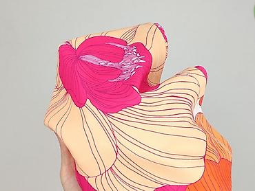 - Wzór: wyraziste, duże kwiaty w kolorach fuksji, różu, pomarańczu i moreli; efekt retro