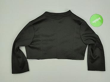 Eleganckie bolerko damskie w kolorze czarnym. Krótki, otwarty fason bez zapięcia, z zaokrąglonymi przodami. Materiał o subtelnym, tłoczonym wzorze rombów, który dodaje głębi i delikatnego połysku. Długie rękawy, niewielka stójka przy dekolcie.