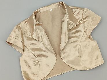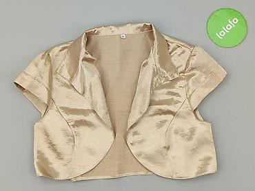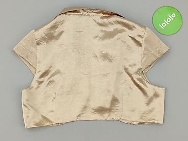 Eleganckie bolerko damskie w kolorze szampańskim/kremowym. - Krój: krótkie bolerko z zaokrąglonym dołem z przodu, delikatnie dłuższy tył - Materiał: gładka, lekko połyskująca tkanina (satynowa) na...